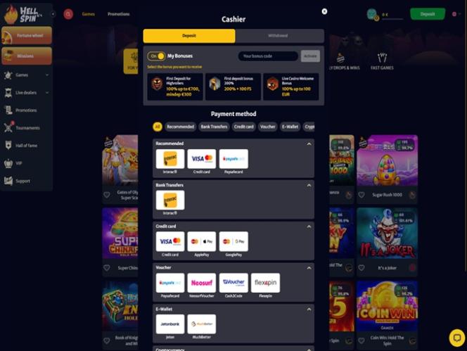 प्रोमो टैब में एक परिचयात्मक डील शामिल है जिसका उपयोग हेलस्पिन में पहले दो डिपॉज़िट के साथ किया जा सकता है। सक्रिय खिलाड़ी आकर्षक साप्ताहिक ऑफ़र और रीलोड बोनस के साथ-साथ रोमांचक स्लॉट टूर्नामेंट का भी लाभ उठा सकते हैं।
