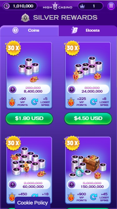 प्रमोशन हाई 5 के अनुभव का एक प्रमुख हिस्सा हैं, और इसकी शुरुआत गेम कॉइन्स, स्वीप्स कॉइन्स और डायमंड्स से बने एक बड़े साइनअप बोनस से होती है, जो आपको एक अच्छा शुरुआती बैलेंस प्रदान करता है जिससे आप सभी गेम्स को ब्राउज़ कर सकते हैं और यह देख सकते हैं कि कौन सा गेम आपकी पसंद के अनुसार सबसे उपयुक्त है।