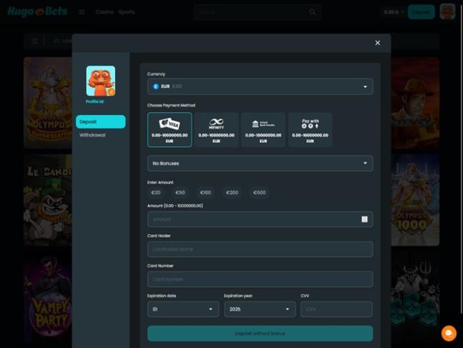 अपने कैसीनो खाते में धनराशि जमा करने और निकालने के लिए, ह्यूगोबेट्स कई भुगतान विधियाँ प्रदान करता है, जिनमें वीज़ा , मास्टरकार्ड, बैंक वायर ट्रांसफ़र , नेटेलर, MiFinity , गूगल पे और स्क्रिल शामिल हैं। इसके अलावा, खिलाड़ी बिटकॉइन , कार्डानो, डॉगकॉइन, एथेरियम , सोलाना, ट्रॉन , टीथर और रिपल सहित कई क्रिप्टोकरेंसी का उपयोग करके अपने फंड का प्रबंधन कर सकते हैं।