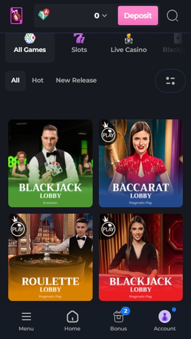 चमकीले रंगों, जीवंत तस्वीरों और आकर्षक एनिमेशन के साथ, यह कैसीनो देखने में आकर्षक और लुभावना है, और कैसीनो की वेबसाइट का डिज़ाइन आधुनिक और उपयोगकर्ता के अनुकूल दोनों है। इसमें गुलाबी नीऑन बटनों से समृद्ध एक गहरे रंग की पृष्ठभूमि का उपयोग किया गया है, जो इसे एक आकर्षक और स्टाइलिश लुक देता है जिसका हमने अपनी यात्रा के दौरान वास्तव में आनंद लिया।