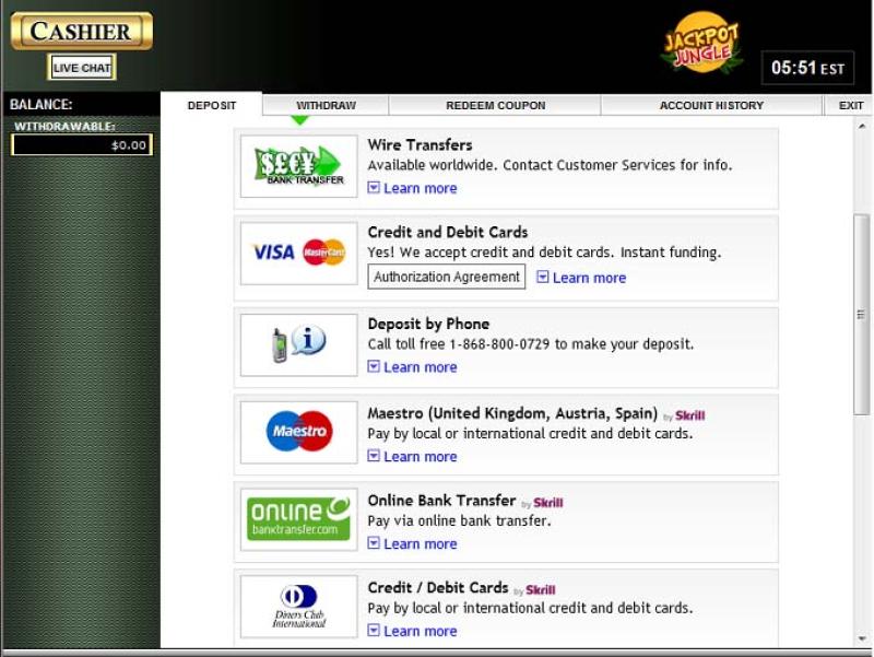 जैकपॉट जंगल कैसीनो Real Time Gaming द्वारा संचालित है, और इसके गेम एक डाउनलोड करने योग्य सॉफ़्टवेयर के साथ-साथ एक इंस्टेंट प्ले प्लेटफ़ॉर्म के माध्यम से उपलब्ध कराए जाते हैं जो आपके वेब ब्राउज़र के माध्यम से खेलने की सुविधा देता है। जो लोग चलते-फिरते खेलना चाहते हैं, उनके लिए एक मोबाइल साइट भी उपलब्ध है।अन्य खेल