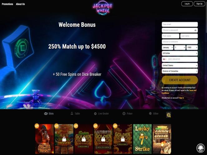 जैकपॉट व्हील कैसीनो एक ऑनलाइन सट्टेबाजी साइट है जिसका स्वामित्व और संचालन आर्डवे लिमिटेड द्वारा किया जाता है, जिसने 2016 में अपनी शुरुआत की थी। यह कैसीनो अमेरिकी सट्टेबाजी बाजार को सेवाएँ प्रदान करता है और डेस्कटॉप और मोबाइल उपकरणों के माध्यम से खिलाड़ियों के लिए स्लॉट और टेबल गेम्स की एक श्रृंखला प्रस्तुत करता है। दुर्भाग्य से, जैकपॉट व्हील में सब कुछ ठीक नहीं है, क्योंकि कैसीनो में जीत पर 48 दिनों का समय लगता है, नकद निकासी की सीमा कम है, और भुगतान समय सामान्य से धीमा है। एक और समस्या समूह के पास गेमिंग लाइसेंस का स्पष्ट अभाव है, जिसके कारण विवाद की स्थिति में खिलाड़ियों के पास कोई सरकारी संस्था नहीं होती जो उनका समर्थन करती हो।