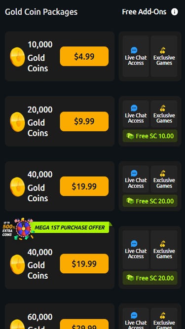 - वेबसाइट पर दो मुद्राएं उपलब्ध हैं: गोल्ड कॉइन्स और स्वीपस्टेक्स कॉइन्स।