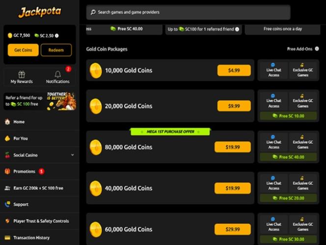 जैकपोटा खिलाड़ियों को गोल्ड कॉइन बंडल खरीदने की सुविधा देता है, जिससे उनका गेमिंग अनुभव और भी बेहतर हो सकता है। कुछ बंडलों के साथ मुफ़्त स्वीपस्टेक्स कॉइन भी उपहार के रूप में मिल सकते हैं। बंडल खरीदने के लिए खिलाड़ी वीज़ा , मास्टरकार्ड , बैंक वायर ट्रांसफ़र और गेम गिफ़्ट कार्ड जैसे कई भुगतान विधियों का उपयोग कर सकते हैं।