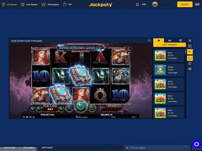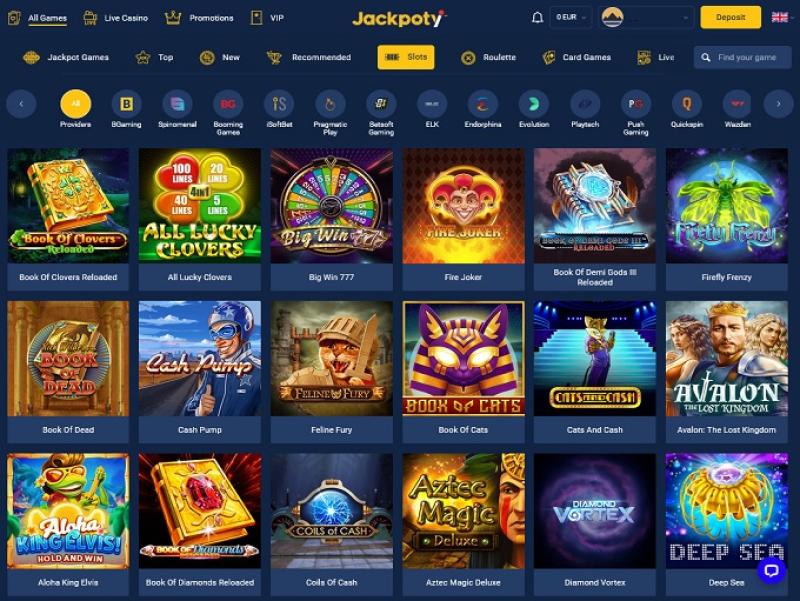 यहाँ कुछ लोकप्रिय स्लॉट गेम दिए गए हैं: बुक ऑफ़ क्लोवर्स रीलोडेड, ऑल लकी क्लोवर्स, बुक ऑफ़ डेमी गॉड्स III रीलोडेड, बुक ऑफ़ कैट्स, एवलॉन: द लॉस्ट किंगडम, अलोहा किंग एल्विस!, बुक ऑफ़ डायमंड्स रीलोडेड, एज़्टेक मैजिक डीलक्स, डीप सी, बुक ऑफ़ पिरामिड्स, बुक ऑफ़ रैम्पेज रीलोडेड, एल्विस फ्रॉग इन वेगास, फ्रूट मिलियन ईस्टर एडिशन, बुक ऑफ़ रीबर्थ रीलोडेड, बुक ऑफ़ ट्राइब्स रीलोडेड, बुक ऑफ़ क्रिसमस रीलोडेड, बुक ऑफ़ चैंपियंस रीलोडेड, बुक ऑफ़ डेमी गॉड्स II - रीलोडेड, बुक ऑफ़ स्कल्स रीलोडेड, ओरिजिन्स ऑफ़ लिलिथ - 10 लाइन्स, ओरिजिन्स ऑफ़ लिलिथ - विस्तारित संस्करण, बुक ऑफ़ द डिवाइन रीलोडेड, लकी लेडी मून, कैश ट्रक, 88 ड्रैगन्स बाउंटी, 20 आइसी फ्रूट्स, 11 करामाती अवशेष, कैच एंड स्नैच, लायन जेम्स: होल्ड एंड विन, वॉर्प व्रेकर्स पावर ग्लिफ़, वार्प व्रेकर्स पावर ग्लिफ़, 7 फॉर्च्यून फ्रेन्ज़ी, फ्रूट ज़ेन, पाइरेट्स मैप, हाई स्ट्रीट हीस्ट, सकुरा फॉर्च्यून 2, 25000 टैलन्स, 9 पॉट्स ऑफ़ गोल्ड हाइपरस्पिन्स, अमेजिंग लिंक फ़ेट्स, कैश 'एन रिचेस मेगावेज़, लैविश जोकर, द मनीमेनिया, पर्ल डाइवर 2: ट्रेजर चेस्ट, रेड चिली विन्स - 9 लाइन्स, 3 डेविल्स पिनबॉल, 4 डायमंड ब्लूज़ - मेगावेज़, वुल्फ पावर: होल्ड एंड विन, 5 स्टार नॉकआउट, 6 टोकन ऑफ़ गोल्ड... ध्यान रखें कि यह जैकपॉटी कैसीनो में उपलब्ध विशाल वीडियो स्लॉट सेक्शन का एक छोटा सा हिस्सा है।
