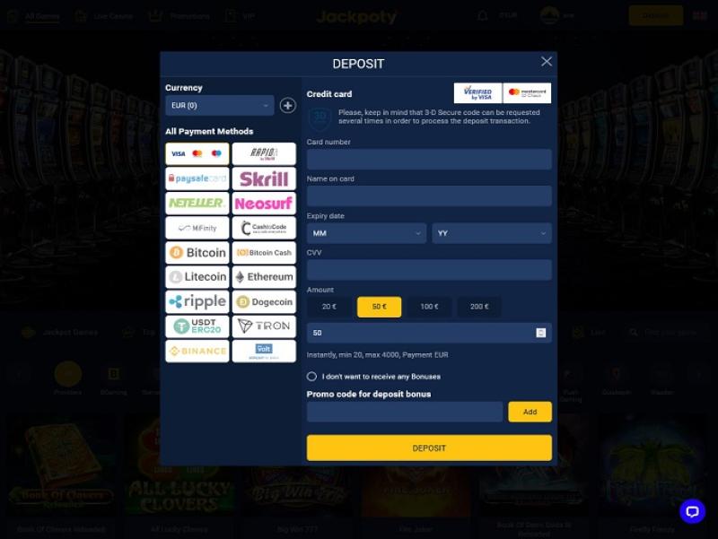 जैसा कि हमने पहले ही उल्लेख किया है, कैसीनो का प्लेटफ़ॉर्म और उपयोगकर्ता का डैशबोर्ड काफी सरल है, इसलिए जैकपॉटी कैसीनो में बैंकिंग बिल्कुल भी जटिल नहीं होनी चाहिए, खासकर क्योंकि खिलाड़ी क्रिप्टोकरेंसी, क्रेडिट और डेबिट कार्ड, तत्काल बैंक हस्तांतरण, ई-वॉलेट सहित सभी लोकप्रिय भुगतान विकल्पों का विशाल बहुमत पा सकेंगे...