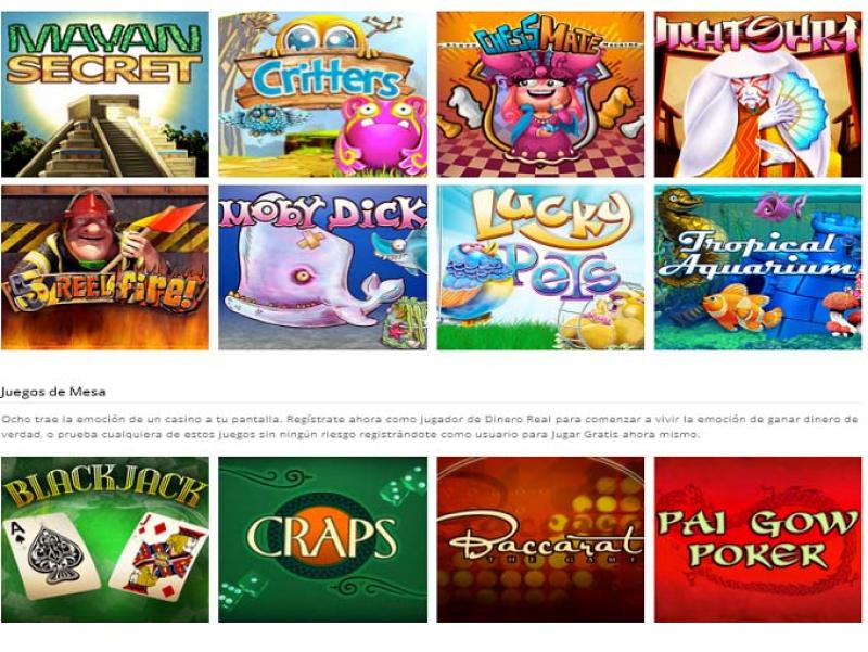 जुएगा ओचो कैसीनो में खेलने के लिए स्लॉट्स का एक बड़ा संग्रह उपलब्ध है, और कई गेम नेट एंटरटेनमेंट के माध्यम से उपलब्ध हैं। कैसीनो प्रोग्रेसिव जैकपॉट भी प्रदान करता है, जिसमें माउस के एक क्लिक से जीते जा सकने वाले बड़े नकद पुरस्कार होते हैं।