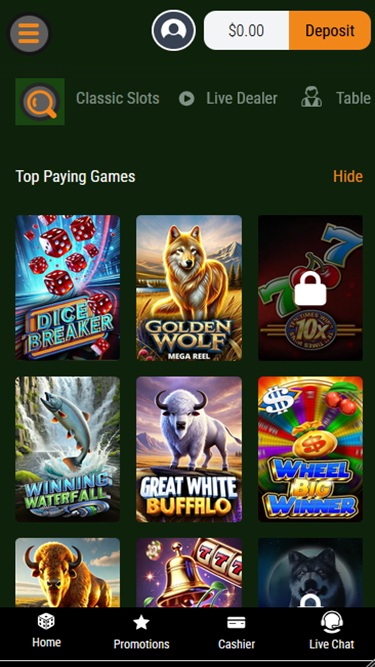 स्लॉट लाइब्रेरी एक मानक RTG-संचालित प्लेटफ़ॉर्म है, जिसमें क्लासिक और आधुनिक दोनों तरह के वीडियो स्लॉट शामिल हैं। गेम थीम के मामले में यह लाइब्रेरी काफ़ी विविध है। लाइब्रेरी में कई प्रगतिशील जैकपॉट हैं, और लगभग सभी गेम मोबाइल संगतता के साथ आते हैं।
