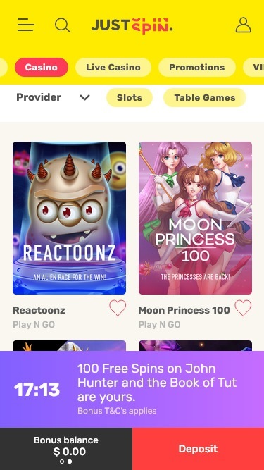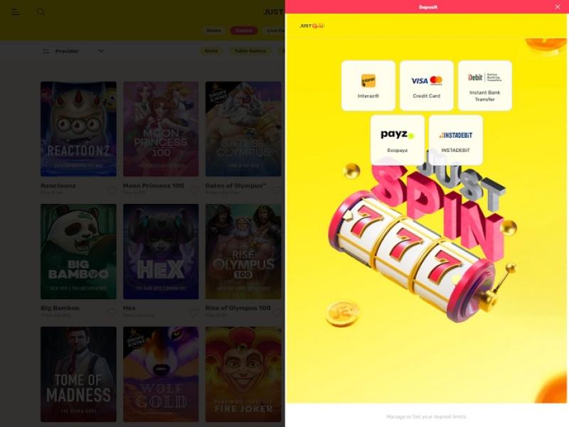 जस्टस्पिन कैसीनो Microgaming, Net Entertainment, BetSoft, 1x2gaming, Barcrest, Big Time Gaming, ELK Studios, Evolution Gaming, iSoftBet, lightningboxgames, Novomatic, Oryx, Play'n GO, playson, Quickspin, Rabcat, Relax Gaming, Thunderkick, Yggdrasil, Endorphina, Wazdan, Booming Games, Pragmatic Play, Nolimit City, Felt Gaming, Red Tiger Gaming, Fantasma Games, FunFair, Kalamba, Triple Edge Studios, Northern Lights Gaming, Stormcraft Studios, Switch Studios, OneTouch, Electric Elephant Games, Pocket Games Soft, Bulletproof Games, All41 Studios, Gluck Games, Gameburger Studios, Pulse 8 Studios, Neon Valley Studios, Golden Rock Studios, Spearhead Studios, Swintt, Shuffle Master, SpinPlay Games, GONG Gaming, Blue Guru Games, Lady Luck Games, Buck Stakes Entertainment, Games Global, 2by2 Gaming, Bally Technologies, bluberi, Blueprint Gaming, GamesOS, Greentube, NextGen, Push Gaming, WMS, SG Interactive, Gamomat, Red7Mobile, Scientific Games, Side City Studios, Bally Wulff, Iron Dog Studio, Foxium, Just For The Win, Reflex Gaming, Storm Gaming Technology, PearFiction Studios, Wild Streak Gaming, Slingshot Studios, Golden Hero, Fortune Factory Studios, Jade Rabbit Gaming, STHLM Gaming, RubyPlay, 4ThePlayer, AvatarUX, Gamevy, Crazy Tooth Studio, ReelPlay, Japan Technicals Games, Alchemy Gaming, Black Pudding Games, Snowborn Games, Boomerang Studios, Hacksaw Gaming, Max Win Gaming, Gold Coin Studios, Bang Bang Games, Half Pixel Studios, Arcadem, SilverBack Gaming, Peter And Sons, Eurostar Studios, Aurum Signature Studios, Armadillo Studios, FlipLuck, Area Vegas, Leap Gaming, Atomic Slot Lab, Indigo Magic, Light & Wonder and NowNow Gaming द्वारा संचालित है और कैसीनो के गेम एक वेब-आधारित प्लेटफ़ॉर्म के माध्यम से उपलब्ध कराए जाते हैं। इसका मतलब है कि यह आपके स्मार्टफ़ोन या डेस्कटॉप पर इंटरनेट ब्राउज़र के माध्यम से सीधे लोड होता है। साइट के रंग मेरी पसंद के हिसाब से थोड़े बोल्ड हैं, लेकिन कैसीनो में नेविगेट करना काफी आसान है।