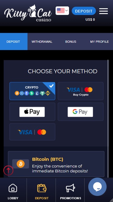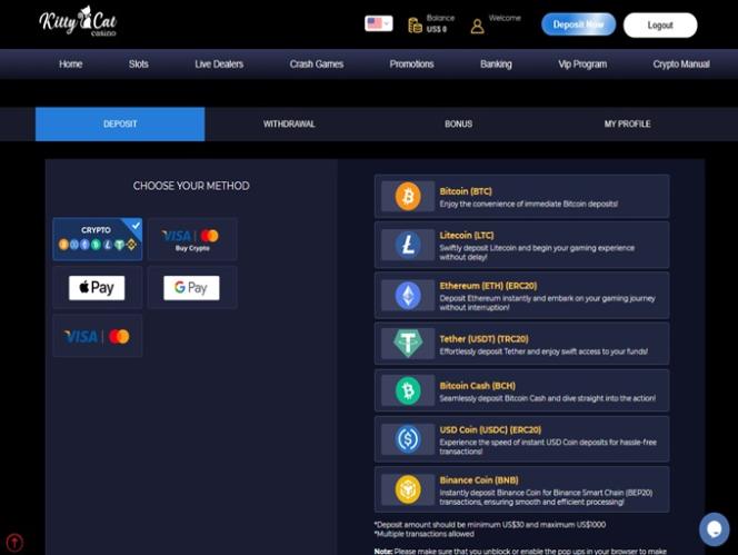 यदि आप क्रिप्टो जमा करने से बहुत परिचित नहीं हैं, तो सुनिश्चित करें कि आप क्रिप्टो मैनुअल अनुभाग की जांच करें, जहां इस प्रक्रिया के सभी चरणों का सरल तरीके से वर्णन किया गया है और सर्वोत्तम संभव तरीके से समझाया गया है कि आप किट्टी कैट कैसीनो में आसानी से क्रिप्टो लेनदेन कैसे कर सकते हैं।