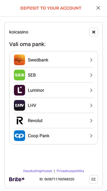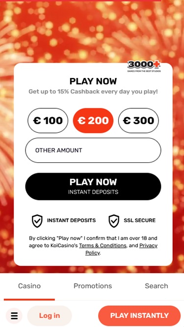 Koi Casino निम्नलिखित देशों के खिलाड़ियों को स्वीकार नहीं करता है: अफ़ग़ानिस्तान, Alabama, अलैंड द्वीप समूह, अलास्का, अल्बानिया, अल्बर्टा, आइल ऑफ़, एलजीरिया, अमेरिकी समोआ, एंडोरा, अंगोला, एंगुइला, अंटार्कटिका, अण्टीगुआ और बारबूडा, अर्जेंटीना, एरिज़ोना, अर्कांसस, आर्मीनिया, अरूबा, ऑस्ट्रेलिया, ऑस्ट्रिया, आज़रबाइजान, बहामा, बहरीन, बांग्लादेश, बारबाडोस, बेलोरूस, बेल्जियम, बेलीज़, बेनिन, बरमूडा, भूटान, बोलीविया, बोस्निया और हर्जेगोविना, बोत्सवाना, बौवेट द्वीप, ब्राज़िल, ब्रिटिश कोलंबिया, ब्रिटिश हिंद महासागर क्षेत्र, ब्रुनेई, बुल्गारिया, बुर्किना फासो, बुस्र्न्दी, कैलिफोर्निया, कंबोडिया, कैमरून, कनाडा, केप वर्ड, केमन द्वीपसमूह, केन्द्रीय अफ़्रीकी गणराज्य, काग़ज़ का टुकड़ा, चिली, चीन, क्रिसमस द्वीप, कोकोस (कीलिंग) द्वीप समूह, कोलंबिया, कोलोराडो, कोमोरोस, कांगो, कांगो लोकतांत्रिक गणराज्य, कनेक्टिकट, कुक आइलैंड्स, कोस्टा रिका, हाथीदांत का किनारा, क्रोएशिया, क्यूबा, कुराकाओ, साइप्रस, चेक रिपब्लिक, डीसी, डेलावेयर, डेनमार्क, ज़िबूटी, डोमिनिका, डोमिनिकन गणराज्य, इक्वेडोर, मिस्र, अल साल्वाडोर, इक्वेटोरियल गिनी, इरिट्रिया, इथियोपिया, फ़ॉकलैंड द्वीप समूह (माल्विनास), फ़रो द्वीप समूह, फिजी, फ्लोरिडा, फ्रांस, फ्रेंच गुयाना, फ़्रेंच पोलिनेशिया, फ्रांसीसी दक्षिणी क्षेत्र, गैबॉन, गाम्बिया, जॉर्जिया, जॉर्जिया, जर्मनी, घाना, जिब्राल्टर, ग्रीस, ग्रीनलैंड, ग्रेनेडा, ग्वाडेलोप, गुआम, ग्वाटेमाला, गिनी, गिनी-बिसाऊ, Guyana, हैती, हवाई, हर्ड द्वीप और मैकडोनाल्ड द्वीप, होंडुरस, हांगकांग, हंगरी, आइसलैंड, इडाहो, इलिनोइस, भारत, इंडियाना, इंडोनेशिया, आयोवा, ईरान, इराक, आयरलैंड, मैन द्वीप, इज़राइल, इटली, जमैका, जापान, जर्सी, जॉर्डन, कान्सास, कजाखस्तान, केंटकी, केन्या, किरिबाती, कोरिया, लोकतांत्रिक जनवादी गणराज्य, कोरिया गणराज्य, कुवैट, किर्गिज़स्तान, लाओस, लातविया, लेबनान, लिसोटो, लाइबेरिया, लीबिया, लिकटेंस्टाइन, लिथुआनिया, लुइसियाना, लक्समबर्ग, मकाउ, मेडागास्कर, मैंने, मलावी, मलेशिया, मालदीव, माली, माल्टा, मैनिटोबा, मार्शल द्वीपसमूह, मार्टीनिक, मैरीलैंड, मैसाचुसेट्स, मॉरिटानिया, मॉरीशस, मैयट, मेक्सिको, मिशिगन, माइक्रोनेशिया, संघीय राज्य, मिनेसोटा, मिसिसिपी, मिसौरी, मोल्दाविया, मोनाको, मंगोलिया, MONTANA, मोंटेनेग्रो, मोंटेसेराट, मोरक्को, मोज़ाम्बिक, म्यांमार, नामिबिया, नाउरू, नेब्रास्का, नेपाल, नीदरलैंड, नीदरलैंड एंटिलीज़, नेवादा, कनाडा का एक प्रांत, नया केलडोनिया, न्यू हैम्पशायर, न्यू जर्सी, न्यू मैक्सिको, न्यूयॉर्क, न्यूज़ीलैंड, न्यूफाउंडलैंड और लैब्राडोर, निकारागुआ, नाइजर, नाइजीरिया, नियू, नॉरफ़ॉक द्वीप, उत्तरी केरोलिना, नॉर्थ डकोट