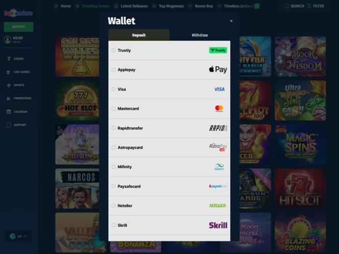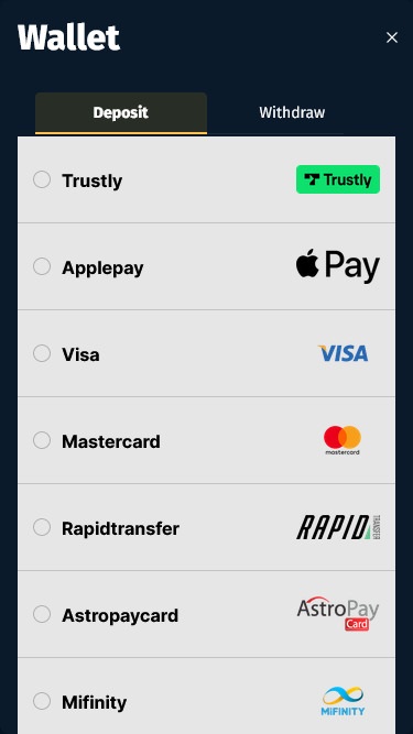बाएं मेनू में जमा या शेष राशि बटन पर क्लिक करने से कैसीनो सदस्यों के लिए उपलब्ध भुगतान विधियों की एक विस्तृत विविधता लोड हो जाएगी।