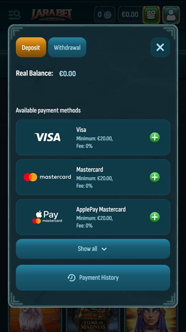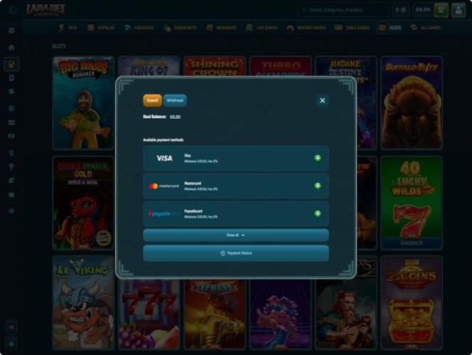 लाराबेट कैसीनो ने अपने बैंकिंग अनुभाग में कई लोकप्रिय समाधानों को लागू करके इन तथ्यों के अनुसार समायोजन किया है, इसलिए यहां आने वाले खिलाड़ियों को बिटकॉइन, बिटकॉइन कैश, कार्डानो , एथेरियम, लाइटकॉइन, रिपल, टीथर और यूएसडी कॉइन का उपयोग करके अपने भुगतान करने का अवसर मिलेगा।