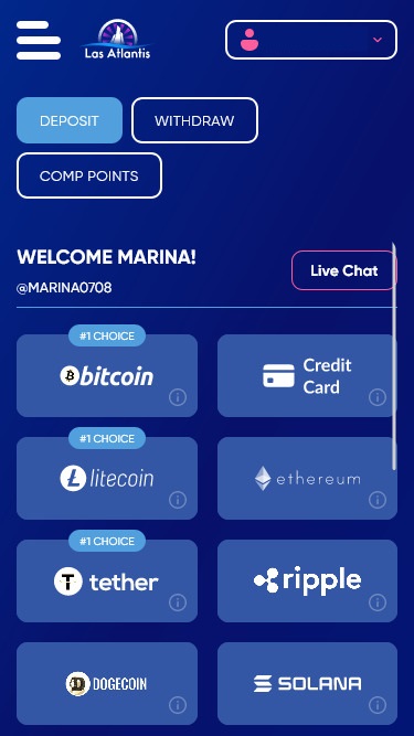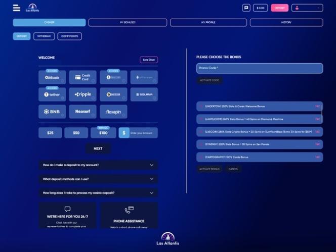 नीचे आपको लास अटलांटिस में विभिन्न बैंकिंग विकल्प मिलेंगे, जिनमें विभिन्न जमा और निकासी विकल्प शामिल हैं।