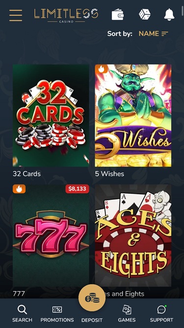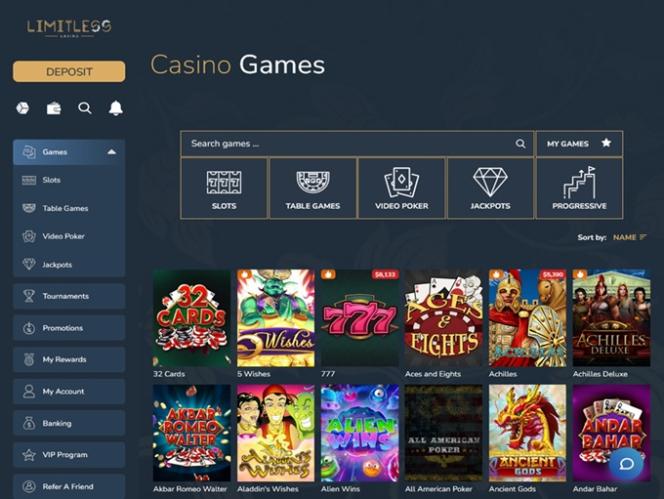 लिमिटलेस कैसीनो जिस कैसीनो प्लेटफ़ॉर्म का इस्तेमाल कर रहा है, उसमें गहरे नीले, स्लेटी और सुनहरे रंगों के साथ डार्क मोड बैकग्राउंड और दिलचस्प ग्राफ़िक चित्र हैं जो क्लासी और खूबसूरत तो लगते ही हैं, साथ ही मज़ेदार और मनोरंजक भी हैं। हालाँकि लाइव-डीलर कैसीनो मौजूद नहीं है, फिर भी कैसीनो में सट्टेबाज़ों के लिए कई अन्य प्रकार के गेम उपलब्ध हैं, और सभी सेक्शन सुव्यवस्थित हैं।