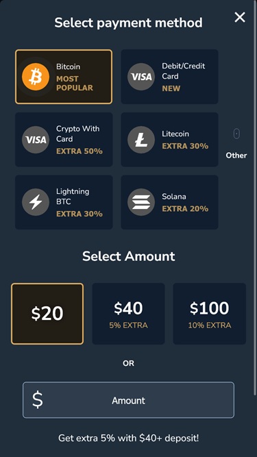 जैसा कि हम पहले ही बता चुके हैं, पंटर्स अपनी पसंदीदा क्रिप्टोकरेंसी चुन सकते हैं और जमा और निकासी के लिए उनका इस्तेमाल कर सकते हैं। पारंपरिक कैसीनो खिलाड़ियों के लिए यह बताना न भूलें कि इस कैसीनो में भुगतान कार्ड भी स्वीकार किए जाते हैं।