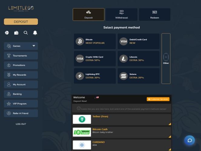 लिमिटलेस कैसीनो एक छोटा यूएसए फ्रेंडली गेमिंग ब्रांड है लेकिन इस साइट पर उपलब्ध क्रिप्टो भुगतान विकल्प कई और काफी प्रभावशाली हैं।