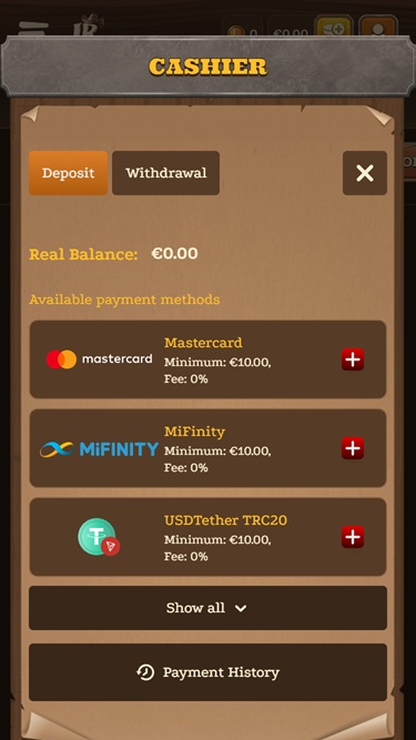 💸 न्यूनतम निकासी€10/ €60 (Bitcoin)