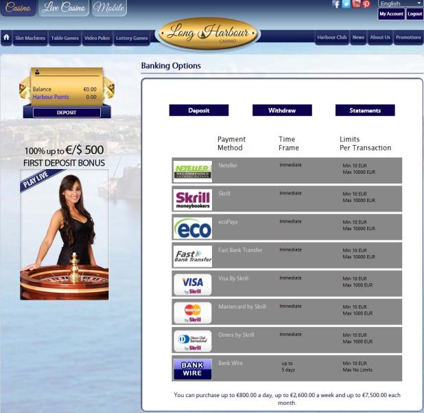 लॉन्ग हार्बर कैसीनो B3W द्वारा संचालित है, और इसके कैसीनो गेम इन-ब्राउज़र इंस्टेंट प्ले प्लेटफॉर्म द्वारा प्रदान किए जाते हैं।Long Harbour Casino पर बैंकिंग विकल्प