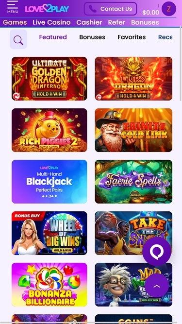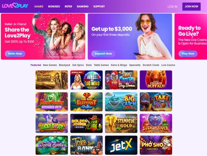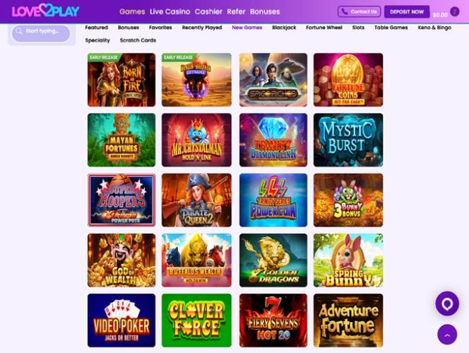 लव2प्ले की लॉबी ब्लैकजैक , गेट स्पिन्स, स्लॉट्स, टेबल गेम्स, केनो और बिंगो , स्पेशलिटी, स्क्रैच कार्ड्स और लाइव कैसीनो जैसी श्रेणियां प्रदान करती है, जो संतोषजनक से अधिक है, और सभी कौशल स्तर और वरीयताओं के खिलाड़ी कैसीनो की पेशकशों की खोज करते हुए मज़े कर पाएंगे।