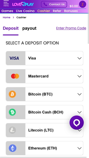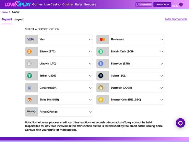 लव2प्ले कैसीनो विभिन्न लोकप्रिय क्रिप्टोकरेंसी का समर्थन करता है, जिसमें कार्डानो, बिटकॉइन, बिटकॉइन कैश, डॉगकोइन, एथेरियम, लाइटकोइन, सोलाना, टीथर शामिल हैं... खिलाड़ियों के खातों को वित्तपोषित करने के लिए, ध्यान दें कि क्रिप्टो बैंकिंग विकल्पों के अलावा, खिलाड़ी क्रेडिट और डेबिट कार्ड, बैंक वायर ट्रांसफर और अन्य विकल्पों का भी उपयोग कर सकते हैं।