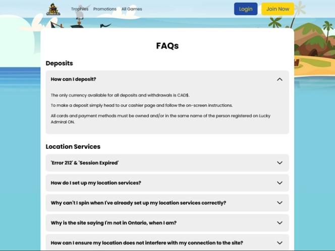 लकी एडमिरल ओंटारियो ने हम पर पहली ही नज़र में एक शानदार छाप छोड़ते हुए शानदार काम किया है। वेबसाइट पर आते ही हमारा स्वागत एक गर्मजोशी भरे और रंगीन माहौल में हुआ। डिज़ाइनरों ने एक समुद्री डाकू थीम चुनी जो जीवंत रंगों और कला शैली के साथ अद्भुत रूप से मेल खाती है जिसमें चमकीले समुद्र और अनोखे द्वीप शामिल हैं।