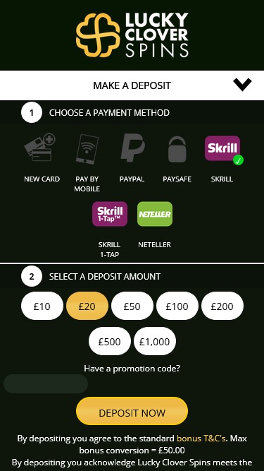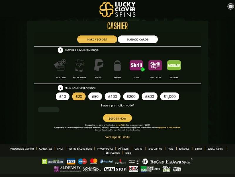 बैंकिंग विकल्पों की बात करें तो, आप वीज़ा, मास्ट्रो, मास्टरकार्ड और पेसेफ जैसे कुछ सबसे लोकप्रिय कार्डों से भुगतान कर पाएँगे। अगर आप चाहें तो पेपाल के ज़रिए भी भुगतान कर पाएँगे। दुर्भाग्य से, लकी क्लोवर स्पिन्स कैसीनो खिलाड़ियों को क्रिप्टोकरेंसी के ज़रिए जमा करने की अनुमति नहीं देता है और हमें उम्मीद है कि भविष्य में इसमें बदलाव आएगा, क्योंकि ज़्यादा से ज़्यादा लोग कैसीनो में जमा राशि के लिए ऐसा ही करना चाह रहे हैं।