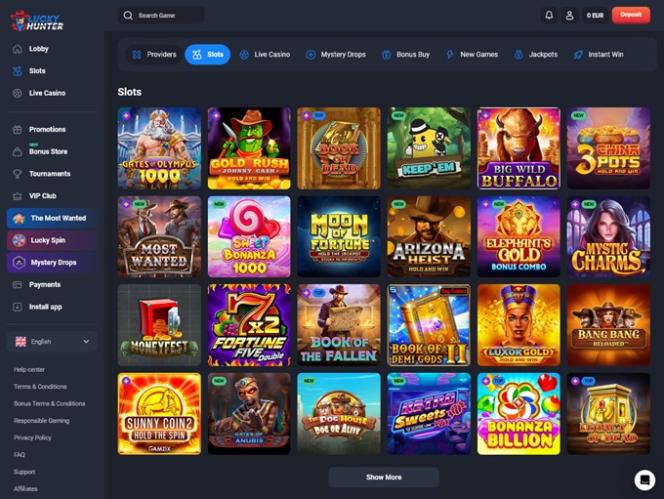 लकी हंटर में आप जो उम्मीद कर सकते हैं, उसका एक छोटा सा अंश यहां दिया गया है: बिग बास बोनान्ज़ा, रिच वाइल्ड और द बुक ऑफ डेड, 30 सिक्के, मेगा कैश द गोल्ड, फॉर्च्यून फाइव, सुपर स्टिकी पिग्गी, एज़्टेक लीजेंड, शुगर रश 1000, लिगेसी ऑफ डेड, बुक ऑफ ट्रुथ, फिस्ट ऑफ डिस्ट्रक्शन, लक ऑफ टाइगर, कॉइन्स ऑफ रा - होल्ड एंड विन, इजिप्ट स्फीयर: होल्ड द स्पिन, द डॉग हाउस मेगावेज, कार्निवल कैट: बोनस कॉम्बो, लकी बैरल टैवर्न...