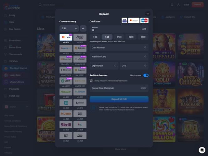 Lucky Hunter Casino पर बैंकिंग विकल्प