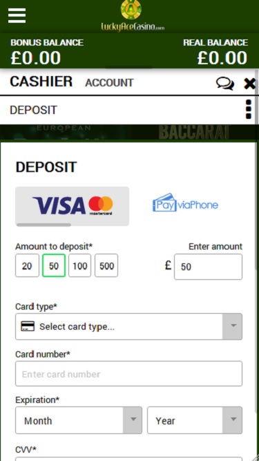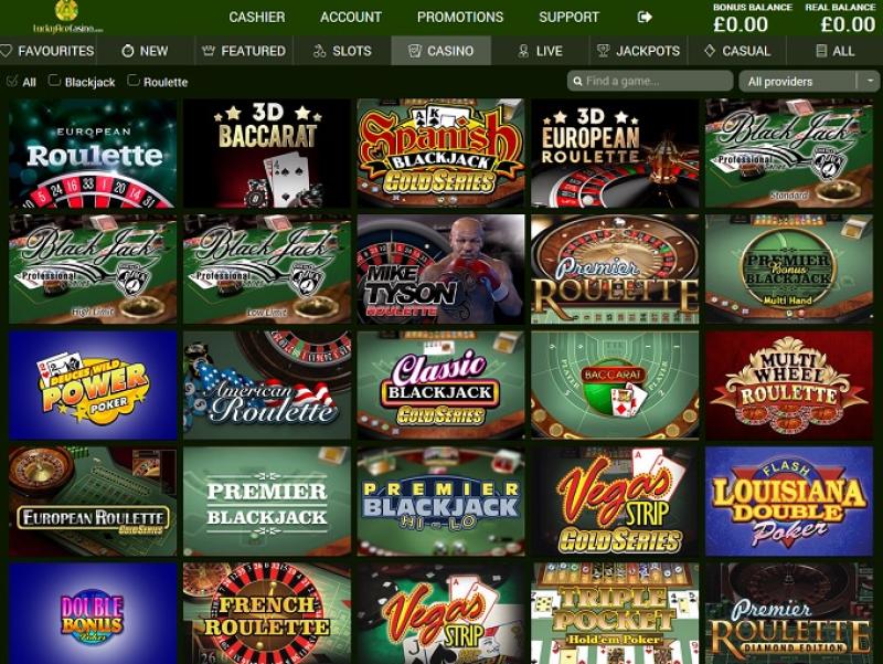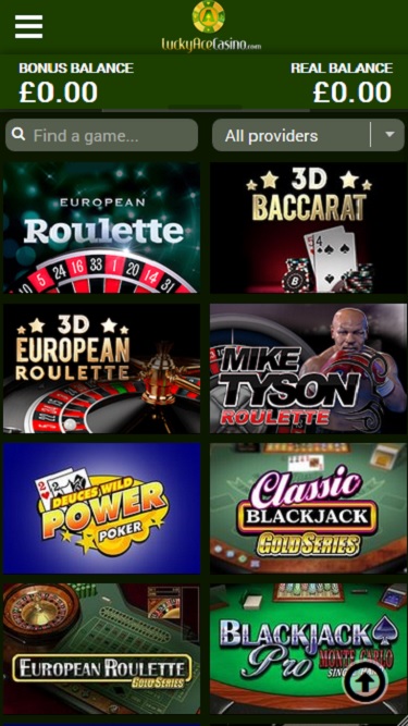 लकी ऐस कैसीनो Microgaming, Net Entertainment, 1x2gaming, Big Time Gaming, ELK Studios, Evolution Gaming, EYECON, Genesis Gaming, lightningboxgames, Play'n GO, playson, Quickspin, Rabcat, Thunderkick, Vivo Gaming, Wazdan, BetConstruct, LuckyStreak, Skillzzgaming, Fantasma Games, Triple Edge Studios, Stormcraft Studios, Switch Studios, All41 Studios, TVBet, Gameburger Studios, Pulse 8 Studios, Super Spade Games, Games Global, 2by2 Gaming, Blueprint Gaming, Games Warehouse, NextGen, Tom Horn Gaming, WMS, Inspired Gaming, Genii, SG Interactive, Red7Mobile, CORE Gaming, Iron Dog Studio, Foxium, Betdigital, Just For The Win, PearFiction Studios, Slingshot Studios, Fortune Factory Studios, Gamevy, Crazy Tooth Studio and Alchemy Gaming द्वारा संचालित है, जो कैसीनो गेम खेलने के लिए एक इंस्टेंट-प्ले मॉडल प्रदान करता है। कैसीनो में एक मोबाइल बेटिंग साइट भी है जो सट्टेबाजों को चलते-फिरते खेलने की सुविधा देती है।Blackjack