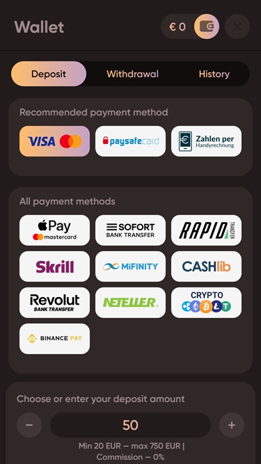 कैसिनो के बैंकिंग अनुभाग में विश्व स्तर पर प्रशंसित मास्टरकार्ड , स्क्रिल, बैंक वायर ट्रांसफर, मिफिनिटी और नेटेलर जैसे कई विकल्प शामिल हैं, साथ ही कई उपलब्ध फिएट मुद्राएं जैसे कि यूरो, स्विस फ्रैंक, डेनिश क्रोन और कैनेडियन डॉलर भी शामिल हैं।