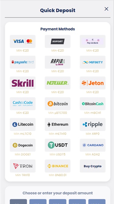 यह ब्रांड अपने उपयोगकर्ताओं को कॉइन्सपेड प्लेटफ़ॉर्म के माध्यम से जमा और निकासी के लिए क्रिप्टोकरेंसी का उपयोग करने का विकल्प भी प्रदान करता है। आप बिटकॉइन , बिटकॉइन कैश , एथेरियम , रिपल , टीथर , यूएसडी कॉइन , डॉगकॉइन और लाइटकॉइन जैसी उपलब्ध मुद्राओं का उपयोग कर सकते हैं।