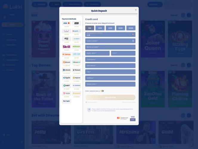 लुकी कैसीनो अपने खिलाड़ियों को वीज़ा , मास्टरकार्ड , नियोसर्फ , नेटेलर , जेटन , स्क्रिल , पेसेफकार्ड और अन्य जैसे कई पारंपरिक भुगतान विधियों में से चुनने की क्षमता प्रदान करता है।