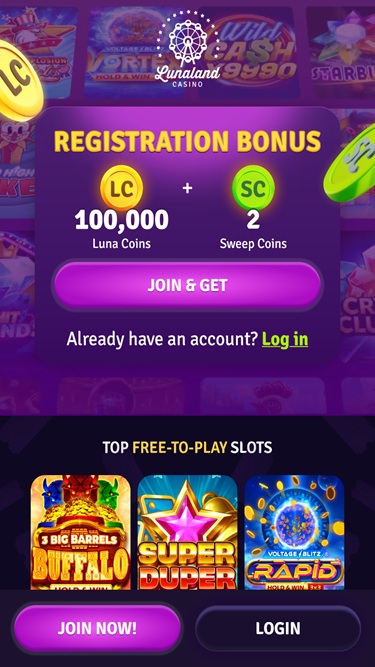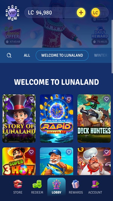 जैसा कि आप एक आधुनिक स्वीपस्टेक्स कैसीनो से उम्मीद करते हैं, लूनालैंड अपने खिलाड़ियों के लिए प्रमोशन और बोनस की एक प्रभावशाली श्रृंखला पेश करता है। सबसे पहले, प्रत्येक नए खाते को स्वीप कॉइन्स और लूना कॉइन्स के मुफ्त बैच से युक्त एक आकर्षक स्वागत पैकेज प्राप्त करने का अवसर मिलेगा।