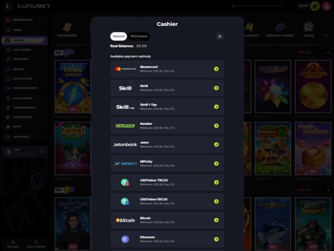 लूनुबेट कैसीनो पारंपरिक और क्रिप्टो भुगतानों की एक उत्कृष्ट श्रृंखला प्रदान करता है, जो दुनिया भर के खिलाड़ियों को उपलब्ध मुद्राओं की एक विस्तृत श्रृंखला प्रदान करता है। क्रिप्टोकरेंसी में रुचि रखने वालों के लिए, उपलब्ध विकल्पों में BTC, DOGE, ETH, LTC, SOL, TRX, USDC, USDT, और बहुत कुछ शामिल हैं।