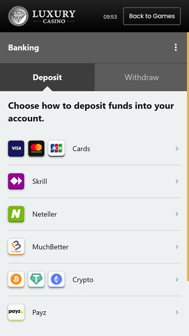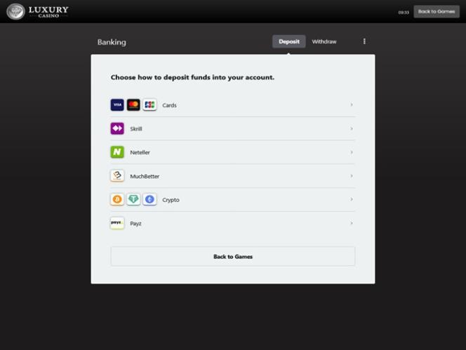 Luxury Casino पर बैंकिंग विकल्प