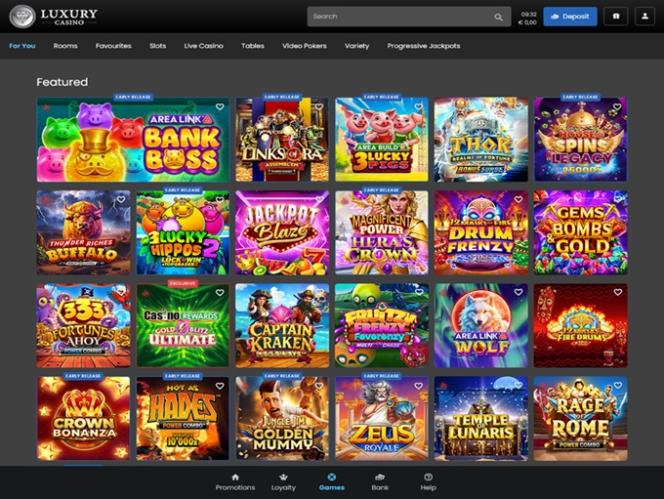 Luxury Casino Microgaming, Evolution Gaming, Pragmatic Play, Triple Edge Studios, Northern Lights Gaming, Stormcraft Studios, Switch Studios, All41 Studios, Gameburger Studios, Pulse 8 Studios, Neon Valley Studios, SpinPlay Games, Real Dealer Studios, GONG Gaming, On Air Entertainment, Buck Stakes Entertainment, Games Global, Old Skool Studios, Foxium, Just For The Win, PearFiction Studios, Wild Streak Gaming, Slingshot Studios, Fortune Factory Studios, Crazy Tooth Studio, Alchemy Gaming, Snowborn Games, Gold Coin Studios, Half Pixel Studios, Eurostar Studios, Aurum Signature Studios, Area Vegas, Wishbone Games, Circular Arrow, HammerTime Games, Nailed It! Games, Neko Games, Reel Kingdom and Oros Gaming द्वारा संचालित है, जो सट्टेबाजों को सैकड़ों खेलों में भाग लेने का अवसर प्रदान करता है। कैसीनो खिलाड़ियों को अपने वेब-आधारित प्लेटफ़ॉर्म के माध्यम से गेम खेलने का अवसर प्रदान करता है, साथ ही यदि वे गेम और कैसीनो प्लेटफ़ॉर्म को अपने कंप्यूटर पर रखना चाहें तो कैसीनो डाउनलोड करने का विकल्प भी देता है।