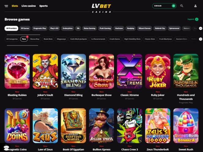 एलवी बेट पर स्लॉट्स की अच्छी-खासी संख्या उपलब्ध है, जिसमें माइक्रोगेमिंग, प्ले'एन गो और थंडरकिक जैसे कई बड़े डेवलपर्स के लगभग एक हज़ार गेम शामिल हैं। चुनने के लिए कई अलग-अलग फ़ीचर और थीम उपलब्ध हैं, और आपको जीतने के लिए प्रोग्रेसिव जैकपॉट भी मिलेंगे। मोबाइल स्लॉट भी उपलब्ध हैं, जिससे आप कहीं भी खेल सकते हैं जहाँ आपको डेटा कनेक्शन मिल सके।