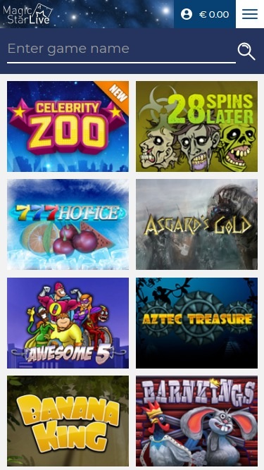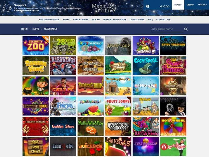 मैजिक स्टार लाइव कैसीनो BetSoft, The Art Of Games, Endorphina, PlayPearls, Spinomenal, Fugaso, We Are Casino and Groove Gaming द्वारा संचालित है, और इसके गेम एक वेब-आधारित इंस्टेंट प्ले प्लेटफॉर्म के साथ-साथ एक मोबाइल साइट के माध्यम से प्रदान किए जाते हैं जो चलते-फिरते खेलने की अनुमति देता है।अन्य खेल