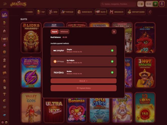 कैसीनो खिलाड़ियों और खेल सट्टेबाज़ों के व्यापक अंतरराष्ट्रीय दर्शकों की ज़रूरतों को पूरा करते हुए, मैगियस कई तरह की भुगतान विधियाँ प्रदान करता है, जो कई फ़िएट और क्रिप्टोकरेंसी स्वीकार करती हैं। हमेशा की तरह, कैशियर में आपको मिलने वाले विकल्पों की सूची आपके निवास देश के अनुसार अलग-अलग हो सकती है, लेकिन निश्चिंत रहें, आपको अपनी पसंद का विकल्प आसानी से मिल जाएगा। अगर आपको अपने क्षेत्र के लिए सबसे अच्छी बैंकिंग विधि के बारे में कोई संदेह है, तो बेझिझक ग्राहक सहायता से संपर्क करें।