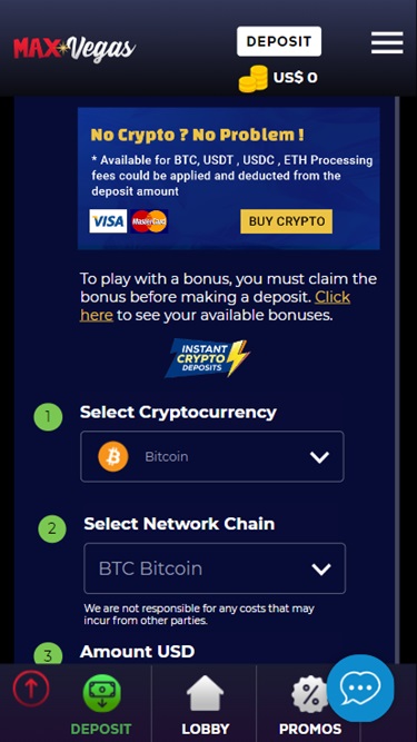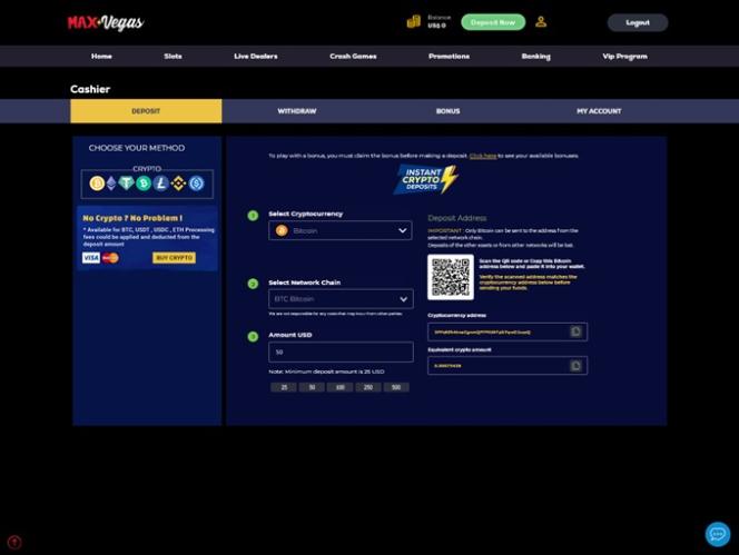 मैक्स वेगास कैसीनो संचालकों ने यह सुनिश्चित किया है कि उनके खिलाड़ी जमा और निकासी के तरीकों के रूप में कई अलग-अलग क्रिप्टोकरेंसी का उपयोग कर सकें। बिटकॉइन , बिटकॉइन कैश, टीथर, एथेरियम, लाइटकॉइन, यूएसडी कॉइन और बिनेंस कॉइन सभी आपके उपयोग के लिए यहाँ उपलब्ध हैं।