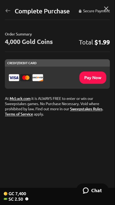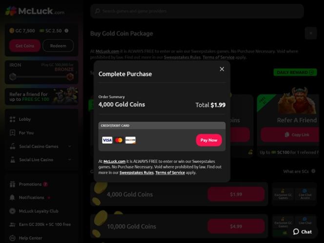 एक सुविचारित और पुरस्कृत लॉयल्टी प्रोग्राम के अलावा, मैकलक कैसीनो अपने आकर्षक प्रमोशनल प्लान के ज़रिए अपने खिलाड़ियों को कई इनाम भी देना चाहता है। अपना खाता बनाने और अपनी पहचान सत्यापित करने के बाद, आप मुफ़्त गोल्ड कॉइन और स्वीपस्टेक्स कॉइन के एक शानदार स्वागत पैकेज का दावा कर सकते हैं।