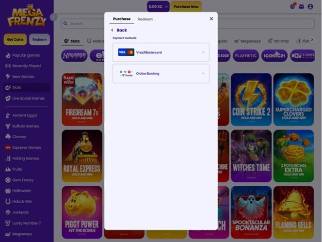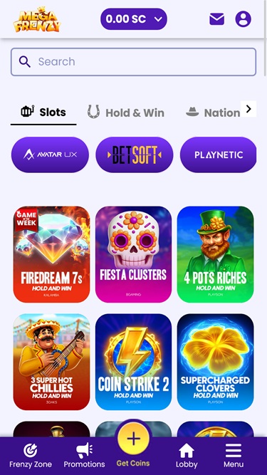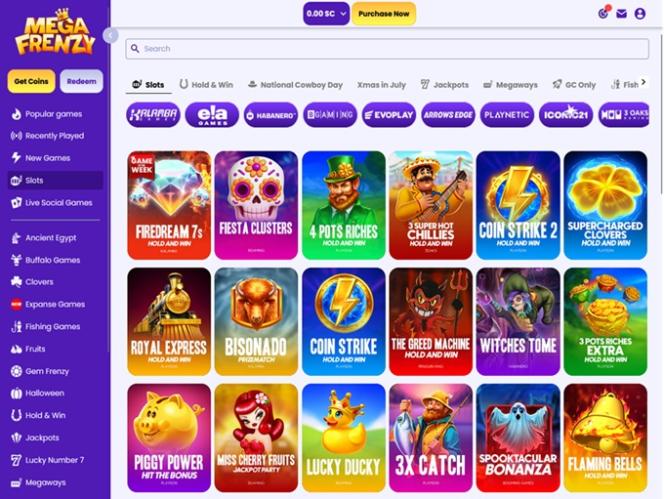 किसी भी अन्य आधुनिक स्वीपस्टेक्स कैसीनो की तरह, मेगा फ़्रेन्ज़ी में भी आपके लिए कैसीनो-शैली के स्लॉट्स का एक विस्तृत संग्रह उपलब्ध है। इस लाइब्रेरी में सभी प्रमुख श्रेणियां और शैलियाँ शामिल हैं, जिनमें मेगावेज़ स्लॉट्स, पुराने ज़माने के रिलीज़, नए संस्करण, जैकपॉट, फ़िशिंग स्लॉट्स, और बहुत कुछ शामिल हैं।