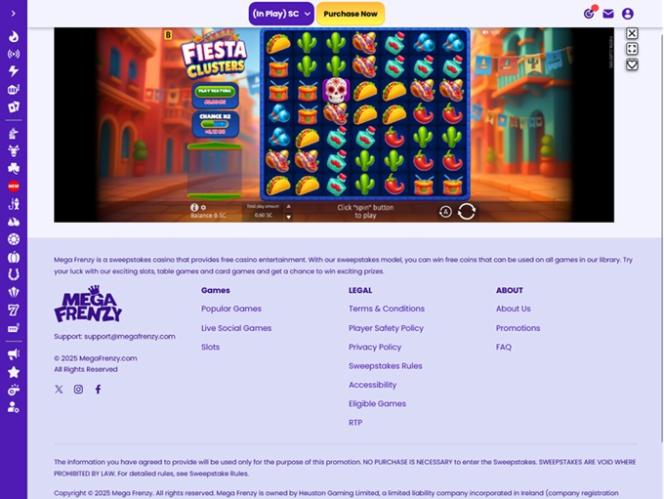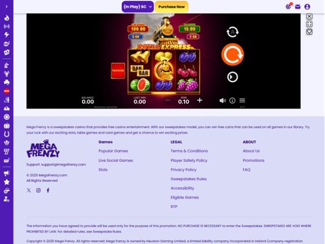 2025 में स्थापित, मेगा फ्रेन्ज़ी कैसीनो एक विशाल स्वीपस्टेक्स कैसीनो है जो गेमिंग विकल्पों की एक विस्तृत श्रृंखला प्रदान करता है: अगर आपको मेगावेज़ जैसे नए स्लॉट और ग्रेविटी ब्लैकजैक और सिक बो जैसे लाइव डीलर पसंद हैं, तो आपको यह बहुत पसंद आएगा। यह ब्रांड संयुक्त राज्य अमेरिका (कुछ राज्यों को छोड़कर) के खिलाड़ियों को स्वीकार करता है और कैसीनो-शैली के ऑनलाइन स्लॉट और लाइव डीलर गेम्स का एक व्यापक चयन प्रदान करता है, साथ ही बोनस, इवेंट और कई अन्य पुरस्कारों वाला एक शानदार प्रचार कार्यक्रम भी प्रदान करता है।
