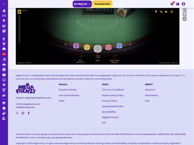 मेगा फ्रेन्ज़ी कैसीनो किसी भी नियामक प्राधिकरण द्वारा लाइसेंस प्राप्त या विनियमित नहीं है।