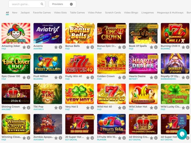 कुछ अनुशंसित शीर्षक हैं: एज ऑफ द गॉड्स अपोलो पावर, अमेजिंग जोकर, एविएट्रिक्स, बोनस बेल्स, बोनस एपिक क्राउन, बुक ऑफ स्पेल्स, बर्निंग चिली एक्स, एपिक क्लोवर 100, फ्रूट मिलियन, फ्रूटी विन 40, गोल्डन क्राउन, हार्ट्स डिजायर, पीओपी पैंथर पेज़ पावर प्ले, पीओपी शार्क्स ब्लिट्ज, रॉयल्टी ऑफ ओलंपस, शाइनिंग क्राउन, टिकी पॉप, वेरी हॉट 5, वाइल्ड हॉट 40, वाइल्ड जोकर हॉट, वाइल्ड लकी क्लोवर, विनिंग क्लोवर 5 एक्सट्रीम, ज़ोंबी एपोपालिप्स, और अधिक।