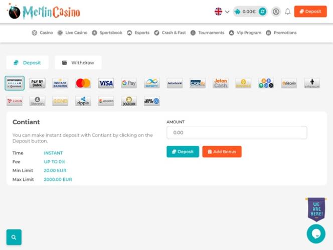 मर्लिन कैसीनो में भुगतान करने के लिए, आप बैंक वायर ट्रांसफ़र, क्रेडिट और डेबिट कार्ड जैसे पारंपरिक भुगतान विकल्पों के साथ-साथ नेटेलर, स्क्रिल, रेवोल्यूट, गूगल पे, ऐप्पल पे जैसे ई-वॉलेट और कई अन्य ऑनलाइन भुगतान प्रणालियों का भी चयन कर सकते हैं। क्रिप्टोकरेंसी भुगतान विकल्प भी उपलब्ध हैं। समर्थित फ़िएट और क्रिप्टो मुद्राओं में ब्राज़ीलियाई रियल, बिटकॉइन, कैनेडियन डॉलर, डॉगकॉइन, एथेरियम, यूरो, लाइटकॉइन, ट्रॉन, टर्किश लीरा, अमेरिकी डॉलर, यूएसडी कॉइन, मोनेरो, रिपल, आदि शामिल हैं।