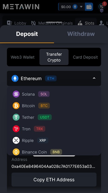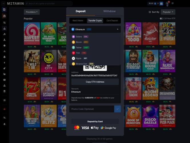 जैसा कि पहले बताया गया है, मेटाविन पूरी तरह से एक क्रिप्टो-उन्मुख ऑनलाइन कैसीनो है, जिसका अर्थ है कि आप अपने धन का प्रबंधन करने के लिए किसी भी पारंपरिक भुगतान विधि का उपयोग नहीं कर सकते। इसके बजाय, आप 25 से अधिक उपलब्ध क्रिप्टोकरेंसी का उपयोग कर सकते हैं, जिनमें से कुछ हैं बिटकॉइन , टीथर , सोलाना , डॉगकॉइन , एथेरियम , यूएसडी कॉइन , रिपल , लाइटकॉइन और ईओएस । इस ब्रांड में एक वेब3 वॉलेट है जिसका आप उपयोग कर सकते हैं, लेकिन यह आपको अपने स्वयं के कस्टोडियल वॉलेट और मूनपे लेनदेन का उपयोग करने की भी अनुमति देता है।