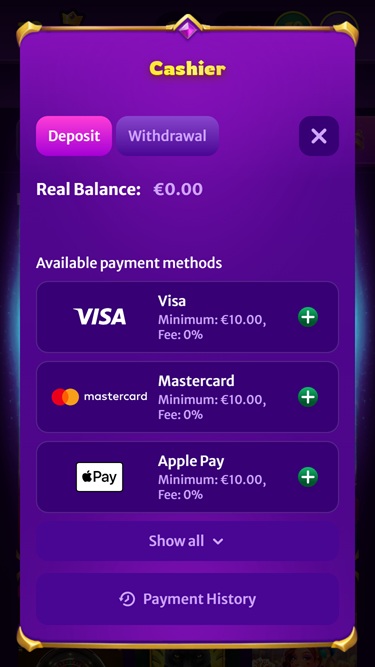 यह प्लेटफॉर्म जमा और निकासी दोनों के लिए कई बैंकिंग विधियां प्रदान करता है, जिनमें एप्पल पे , बैंक वायर ट्रांसफर, बिटकॉइन, बिटकॉइन कैश और बीस से अधिक अतिरिक्त भुगतान विकल्प शामिल हैं।