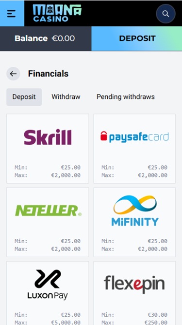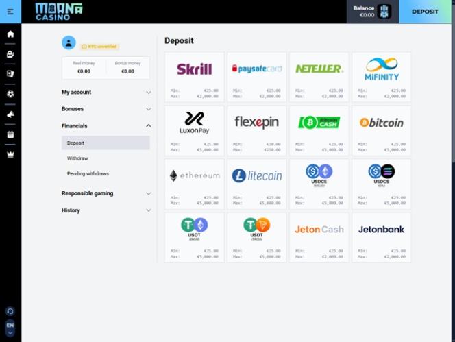 कैसीनो जमा और निकासी के लिए फिएट मुद्राओं और क्रिप्टोकरेंसी को स्वीकार करता है।